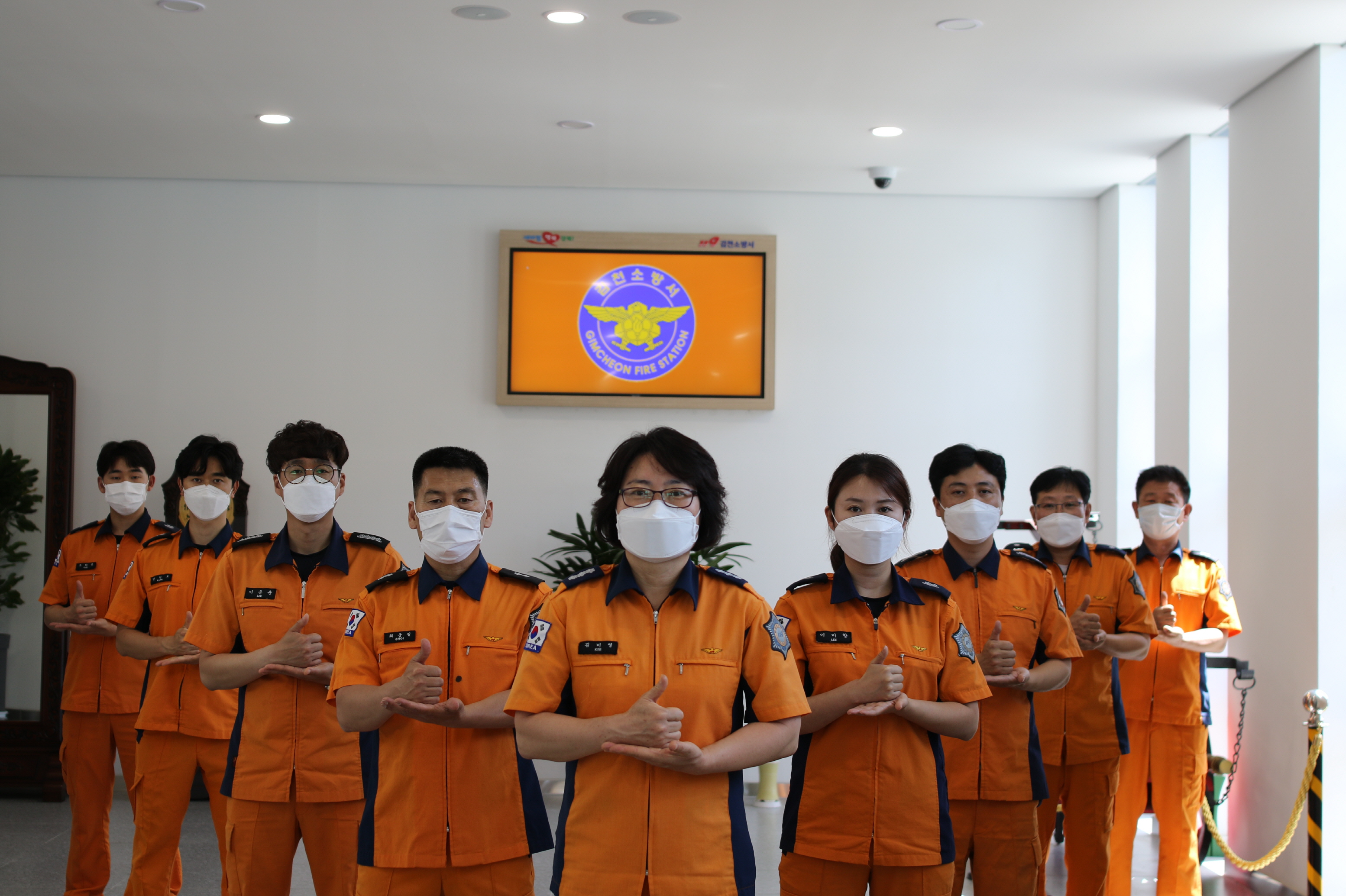 | 김천소방서 구조구급과에서는 6월 1일 김천소방서 전정에서 코로나19 극복과 의료진에게 감사 메시지를 전달하기 위한 ‘덕분에 챌린지’ 캠페인에 동참했다.