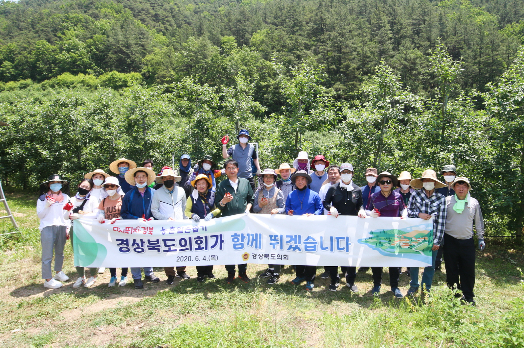 | 경상북도의회사무처(처장 민인기)에서는 6월 4일 지역의원인 임미애 도의원을 비롯하여 직원 43명이 참여한 가운데 의성의 과수농가를 방문하여 사과적과 및 주변 환경정비 등 농촌일손돕기를 실시하였다.