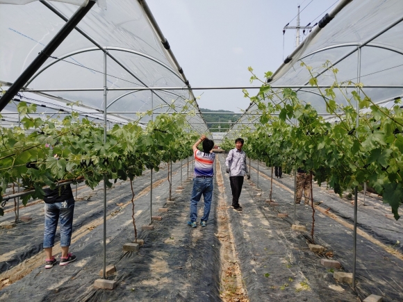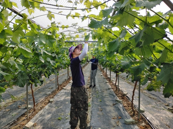 이날 활동은 바쁜 농사철에 일손부족의 어려움을 겪고 있는 농가를 돕기 위해 추진되었으며, 전 직원이 한마음으로 구슬땀을 흘리며 포도순따기 등에 일손을 보탰다.