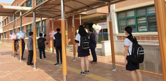 | 아포중학교(교장 홍석진)에서는 이른 아침부터 전교직원과 축하 현수막, 풍선길 등의 환영을 받으며 마침내 신입생들의 등교가 시작되었다. 발열 체크를 하는 입구에는 ‘등교 개학을 축하합니다. 만나서 반가워요.’라는 플래카드가 걸려 있고 발열 체크를 하기 위해 학생들이 안전하게 거리를 유지하며 서 있고 보건 교사의 발열 체크가 끝나면 교실로 입실하게 하였다.