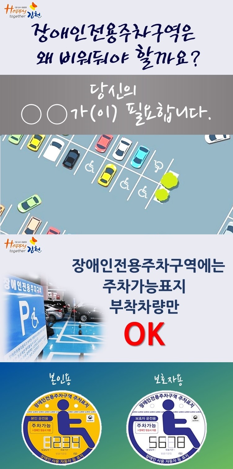 장애인전용주차구역은 주차가능표지를 부착하고 해당 장애인이 탑승한 경우에만 주차가 가능하며, 일반 차량이 해당구역에 주차할 경우 10만원의 과태료가 부과된다. 작년 한 해 동안 생활불편신고 스마트폰 앱을 통한 시민 공익신고 건수는 무려 2,600여건에 달했다. 이에 사후 과태료 부과 방식에서 사전 계도 및 시민의식 개선에 중점을 두고 장애인전용주차구역 준수 카드형 뉴스를 제작하여 읍면동 주민 밴드 및 SNS를 통해 홍보하고 있으며, 주요 위반 지역에 장애인전용주차구역 준수 안내판을 자체 제작하여 부착하는 등 지속적이고 다양한 홍보 활동으로 장애인 이동편의 보장 및 성숙한 시민의식 함양을 위해 노력하고 있다.