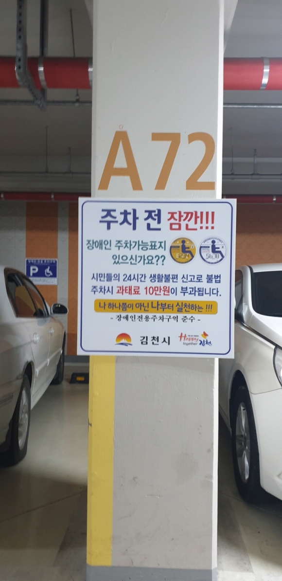 장재근 사회복지과장은 “주차공간 부족과 차량증가 현상이 맞물려 이동 편의를 보장받지 못하는 장애인과 주차할 곳을 찾지 못하는 비장애인의 고충이 적지 않다고 생각한다. 하지만 장애인을 배려하는 마음으로 장애인전용주차구역을 비워두는 아름다운 질서 문화가 정착되기를 바라며, 나부터 실천하는 배려에서 질서는 지켜지고 이런 행동이 전파되면 시민 모두가 행복한 김천은 만들어질 것이다”며 시민들의 장애인전용주차구역 준수를 당부했다.