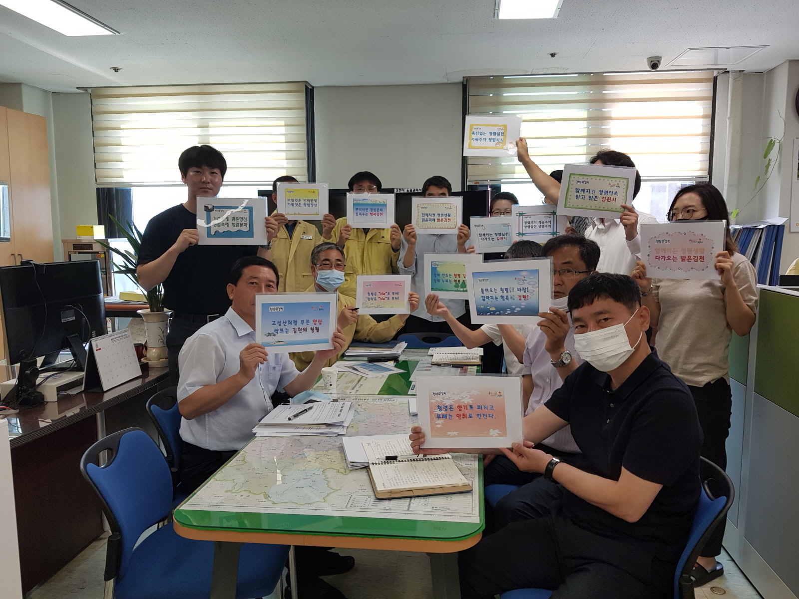 | 김천시 도로철도과는 지난 8일 청렴 분위기 확산을 위하여 ‘1인 1청렴 좌우명 실천 운동’결의대회를 가졌다.