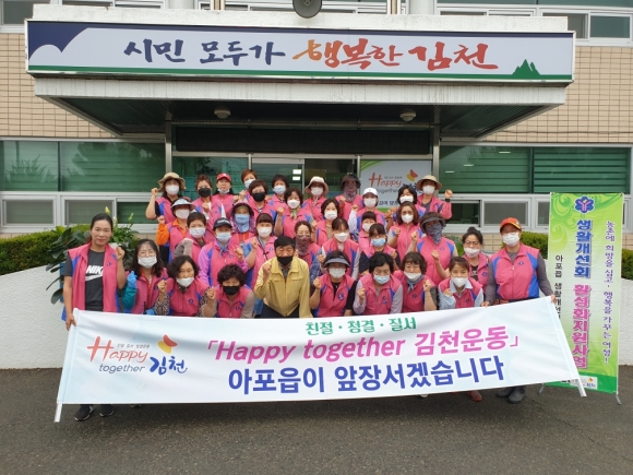 | 아포읍 생활개선회는 6.11(목) 청결하고 쾌적한 환경조성을 위하여 회원 40여명이 참석한 가운데 「Happy together 김천」운동 청결활동을 실시하였다.