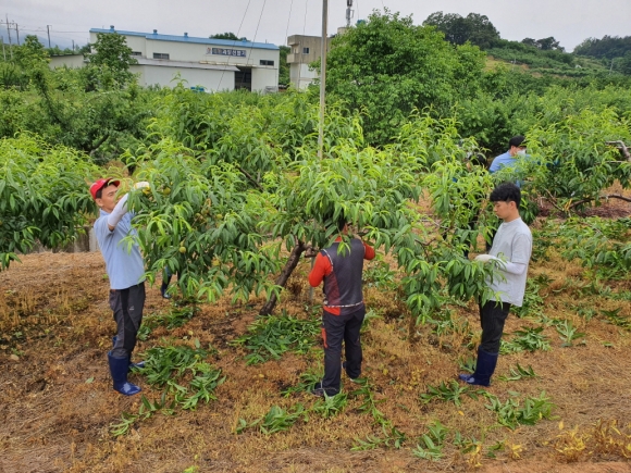 | 김천시 지좌동 행정복지센터(동장 이종탁) 직원 10여명은 영농철 일손부족의 어려움을 겪고 있는 복숭아 재배 농가를 찾아 농촌일손돕기 활동을 펼쳤다.