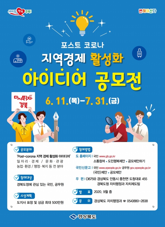 이번 대상전은 모형, 디자인시안 등 창작광고물부문과 기설치 광고물부문으로 나누어 진행되며, 8월 20일부터 22일까지 3일간 작품접수를 받는다. 응모자격은 접수일 현재 경상북도 내에 거주하는 도민 및 도내 소재한 초․중․고등학교, 대학교(원) 재학생이면 누구나 응모가 가능하다.