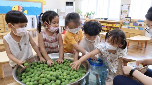 매실청 담그기에 유아들은 크게 관심을 보이며 서로 매실청 담그기에 참여하려고 하였다. 한 유아는“매실청 담그기가 너무 신기해요. 집에서도 엄마와 함께 담그어 볼래요.”라며 즐거운 표정을 지었다.