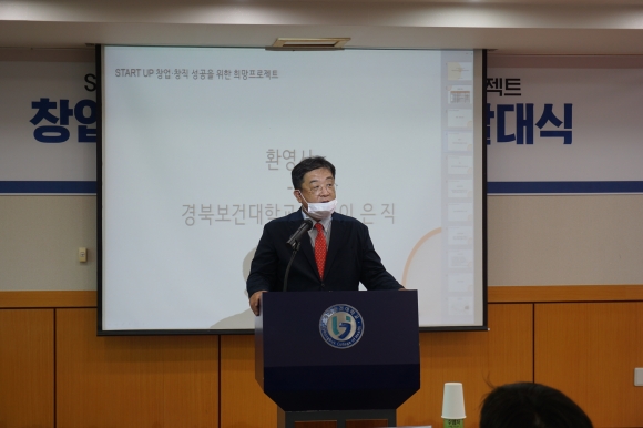 | 경북보건대학교 총장(이은직)은 "포스트 코로나 시대로 인해 이전과는 전혀 다른 창업·창직 경제 질서를 만들어가는 이 시점에서 멋진 도전을 시작하는 예비창업자들에게 진심을 다해 응원하고, 예비창업자들의 용기 있는 시작이 더 빛을 발할 수 있도록 함께하겠다."고 말했다.