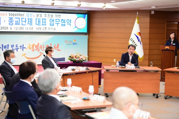 | 김천시(시장 김충섭)는 김천시 기독교 총연합회, 김천 불교사암 연합회, 천주교 대구대교구 김천지역 성당과 12일 김천시청 2층 회의실에서 「Happy Together 김천」운동 추진의 유기적 협력체계 구축을 위한 업무협약을 체결했다.
