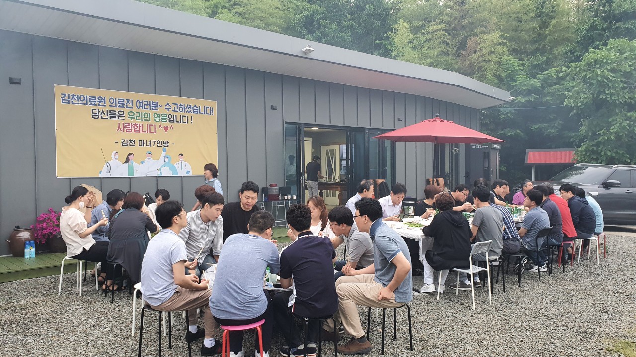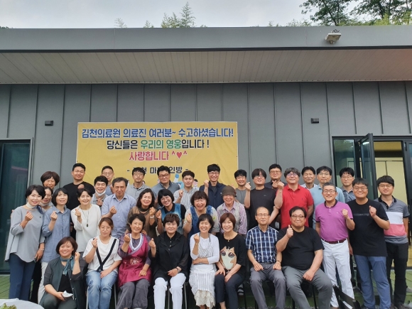 명박골표고 강성대, 장만나는 임미숙, 새코미찰보리빵 조현숙, 삼도봉천마 구나윤, 도마네 꿀집 이선화, 수도산 놀숲농원 김영혜, 송알송알산골이야기 전경정 대표로 구성된 이들 마녀 7인방은 13일 김천의료원 김미경 원장을 비롯한 40여명의 의료진을 구성면 장만나는 농장으로 초청하여 코로나19로 시민과 도민의 건강을 위해 애쓰신 노고에 보답하고자 정성어린 저녁 식사와 직접 생산한 농산물 키트 선물을 전달했고, 이에 김천의료원에서도 답례로 방역 마스크를 전달하여 훈훈한 정을 나누었다.