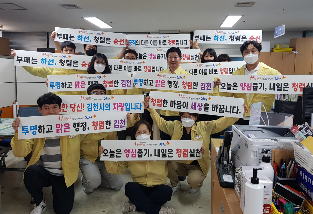 또한, 퀴즈대회 이후 “부패는 하선, 청렴은 승선”,“투명하고 맑은 행정, 청렴한 김천”,“오늘은 양심줍기, 내일은 청렴실천”, “청렴한 마음이 세상을 바꿉니다” 등 다양한 청렴 실천 문구를 활용한 퍼포먼스를 시행하였다.