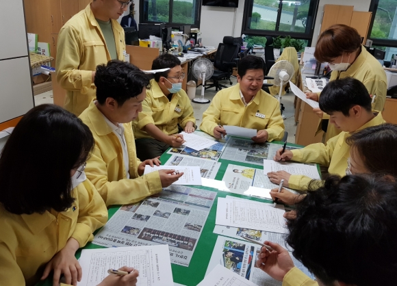 | 김천시 일자리경제과(과장 김대균)에서는 부서 내 동료(Coworker)간 청렴도를 지속적으로 모니터링(Monitoring)하여 부패 유발 요인을 사전에 제거하고 청렴한 조직 문화 형성을 통해 행정의 신뢰도를 높이고자 청렴 MC (Monitoring-Coworker)양성에 나서고 있다.