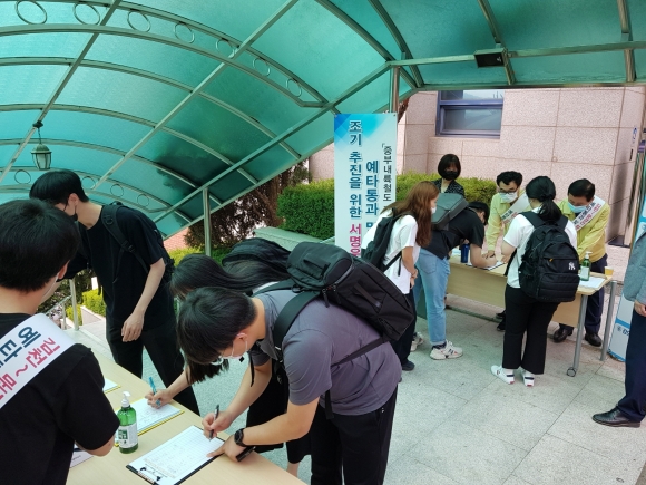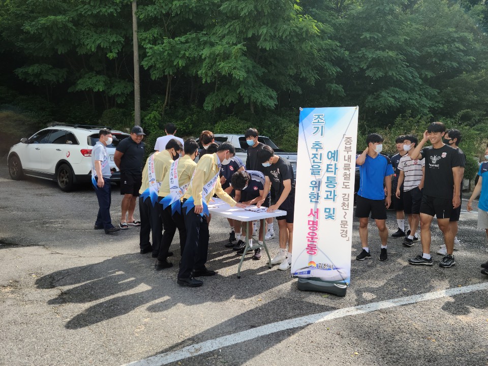| 김천시 도로철도과 직원들은 15일 관내 김천대학교, 경북보건대학교를 찾아 학생들을 대상으로 “김천~문경간 철도건설사업” 조기 구축을 위한 서명 운동을 전개했으며, 앞으로 전 시민은 물론이고 대형상가, 관광지 등에서 지속적으로 서명 운동을 하겠다고 밝혔다.