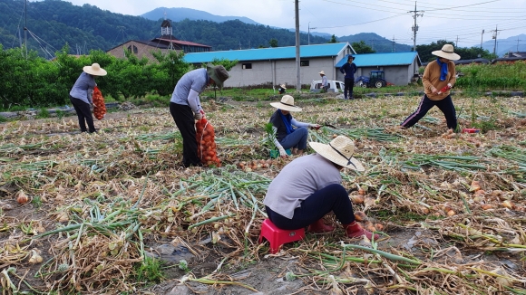 | 김천시 정보기획과(과장 정세영)는 양파 수확기를 맞아 지난 12일 관내 양파 생산량이 많은 구성면의 한 농가를 방문해 농촌일손돕기에 나섰다.