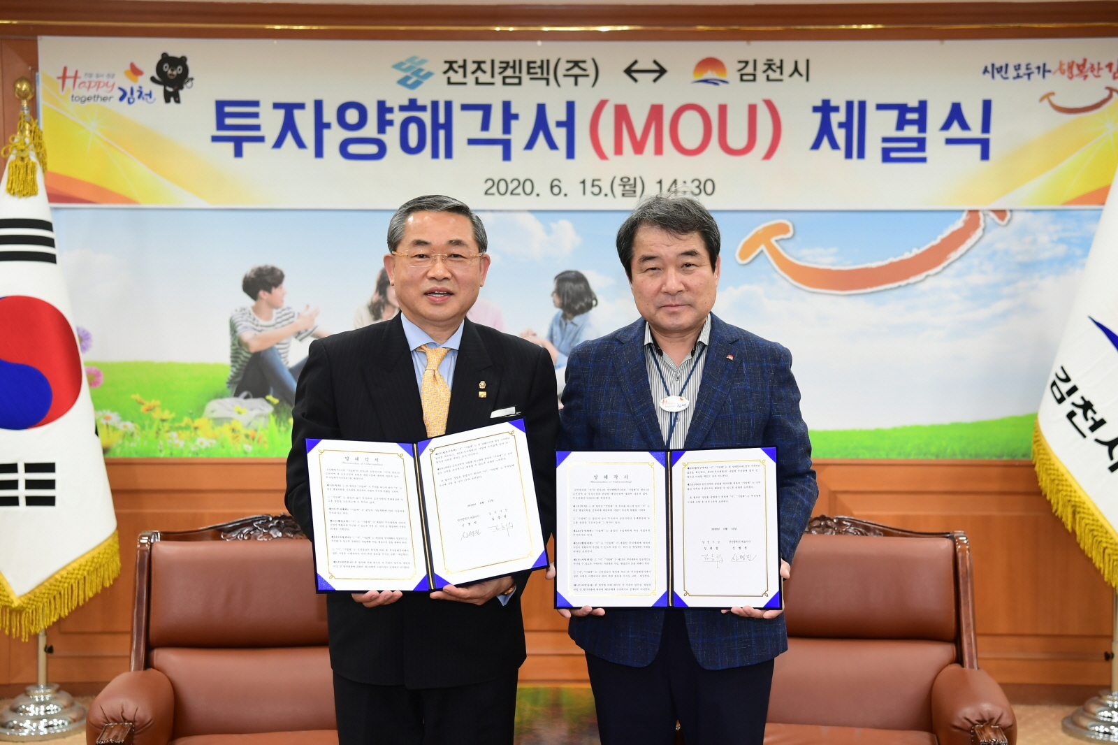 | 김천시(김천시장 김충섭)는 지난 15일 김천시청 접견실에서 김충섭 김천시장, 전진켐텍㈜ 신명진 대표 등이 참석한 가운데 전자부품 생산공장 설립을 위한 투자양해각서(MOU)를 체결했다.