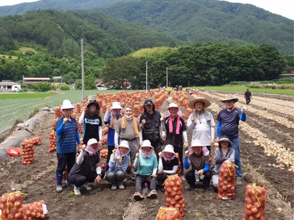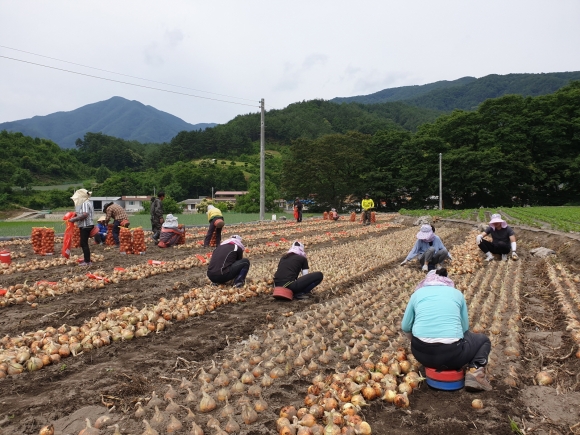 | 김천시에서는 농번기 인력난으로 어려움을 겪고 있는 농민들을 위한시청직원들의 ‘농촌 일손돕기’가 계속 진행되고 있다. 문화홍보실(실장 손세영)에서도 지난번 포도농가에 이어 이날 17일, 양파수확을 위해 전직원이 부항면의 한 농가를 찾았다. “양파는 파종부터 수확까지 일일이 사람의 손을 거쳐야 한다. 바쁘신 중에 잠깐이지만 이렇게 와서 손을 빌려주시는게 우리들 농민 입장에서는 여간 고마운게 아니다.” 농가주는 새벽부터 찾아온 직원들을 반갑게 맞았다.