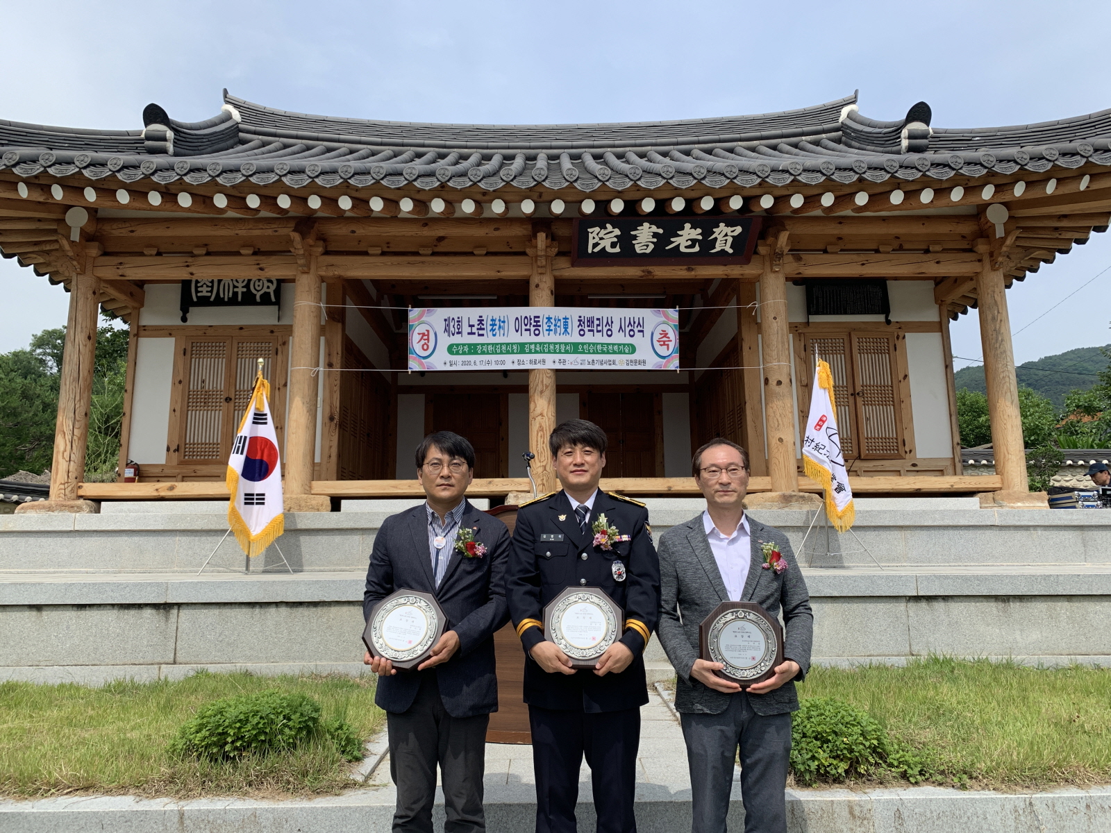 지난 17일, 이약동선생의 사당인 청백사가 자리한 하로서원에서 개최된 이날 시상식에는 우지완 김천경찰서장, 정근재 노촌기념사업회이사장, 이기양 김천문화원장을 비롯한 관내 기관단체장과 이동원 벽진이씨평정공파회장을 비롯한 후손과 수상자 가족 및 동료직원 등 50여명이 참석한 가운데 코로나 19와 관련해 약식으로 열렸다.