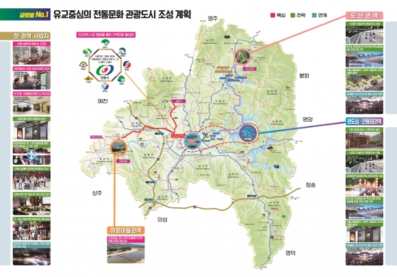 관광거점도시의 핵심사업으로 △하회마을과 봉정사 주변을 영국여왕과 왕자가 방문한 코스로 개발해 외국인 관광객 수요창출 위한 ‘세계유산과 로열웨이 명품 관광자원화 사업’, △펜션, 한옥고택, 모텔 등에 대한 ‘관광숙박시설 개선 및 확충’, △정보통신기술(ICT)을 활용한‘스마트 관광안내체계 구축’, △펜션, 한옥, 모텔 등 숙박시설과 음식점의 질적 개선을 위한 ‘숙박 및 음식점의 관광품질인증제 도입’ 등을 추진할 계획이다.