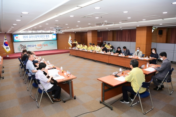 | 김천시(시장 김충섭) 민선7기 정책자문단(위원장 홍진영) 회의가 6월 19일(금) 14시부터 시청 2층 회의실에서 김천시장, 정책자문단 위원 및 해당 실과장‧팀장이 참석한 가운데 2020년도 상반기 정기회의를 개최했다.