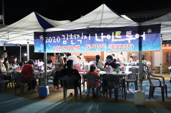 | 지난 6월 20일 사명대사 공원에서 올해 두 번째로 직지나이트투어를 실시했다. 과일 주산지인 김천의 장점을 활용한 제철과일 복숭아 수확체험을 시작으로, 해설사와 함께하는 직지사 탐방, 저녁식사, 청사초롱 만들기, 도자기와 천연염색 스카프 만들기, 다도(茶道), 포도송편 맛보기, 내가 만든 청사초롱 들고 보물찾기 등 다채로운 일정으로 진행되었다. 계절별 농특산물 수확 및 도자기 만들기 체험은 온가족이 신나게 즐길 수 있는 프로그램으로 매년 참가객들의 최고 인기프로그램이다. 또한 투어중간에 찍은 가족사진을 오픈채팅방에 올리면 인화해서 증정하는 이벤트도 열려 김천 직지나이트투어를 더욱 풍성하게 만들었다. 한편 직지나이트투어는 경상북도 야간관광상품 지원 대상 2년 연속 최고등급을 받는 등 대외적으로도 우수성을 인정받았다. 2020년 김천 직지나이트투어 참가비는 1인 15,000원(12개월 이하는 무료)이고 사전 예약으로 가능하며, 예약은 김천문화원 (☎054-434-4336) 및 직지나이트투어 홈페이지(www.nighttour.org)에서 가능하다.