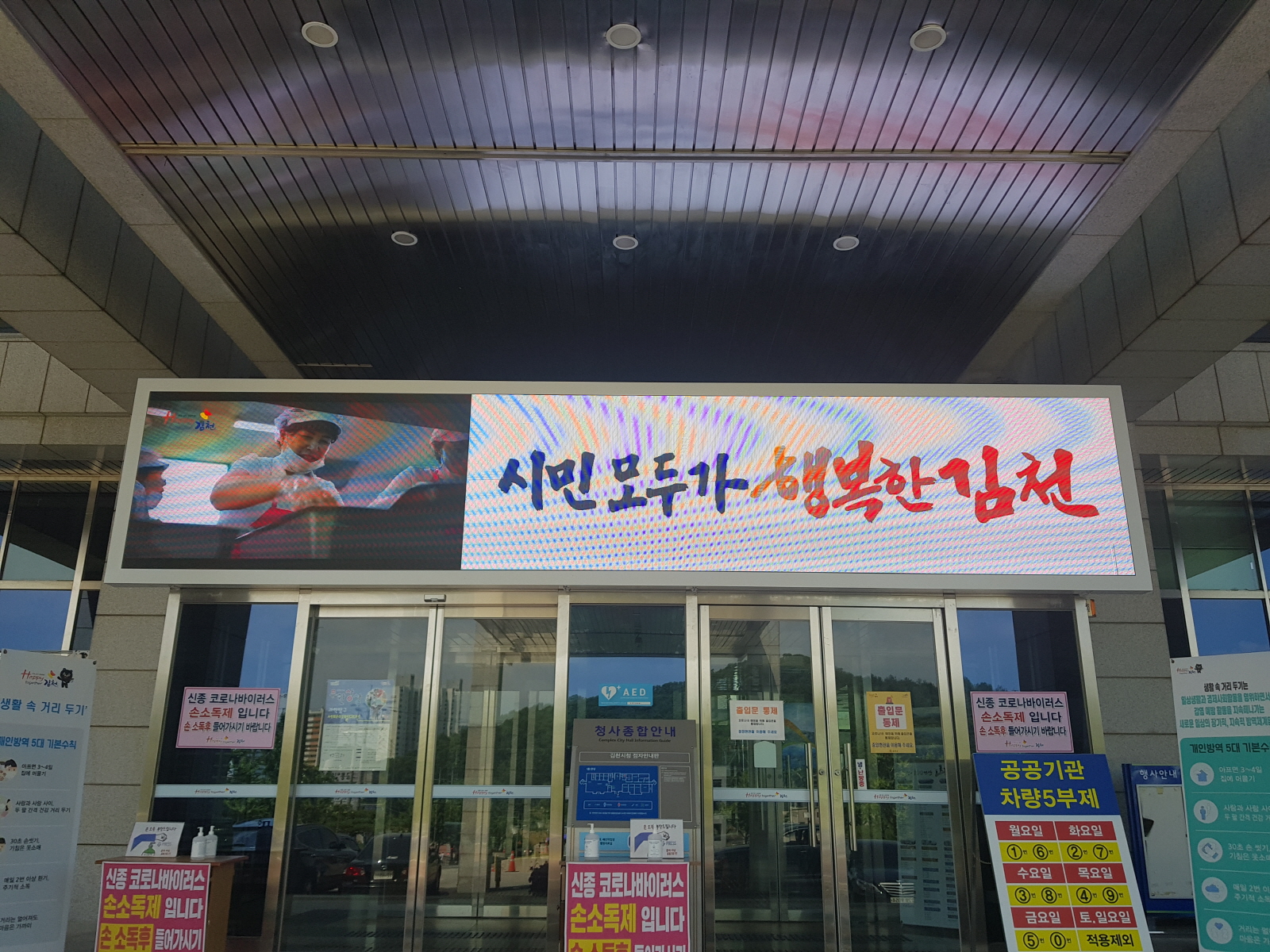| 김천시는 지난 20일 시청사 현관에 위치한 시정홍보용 현수막 걸이대를 정비하여 LED전광판(가로6.5m, 세로1.5m)을 설치하였다.