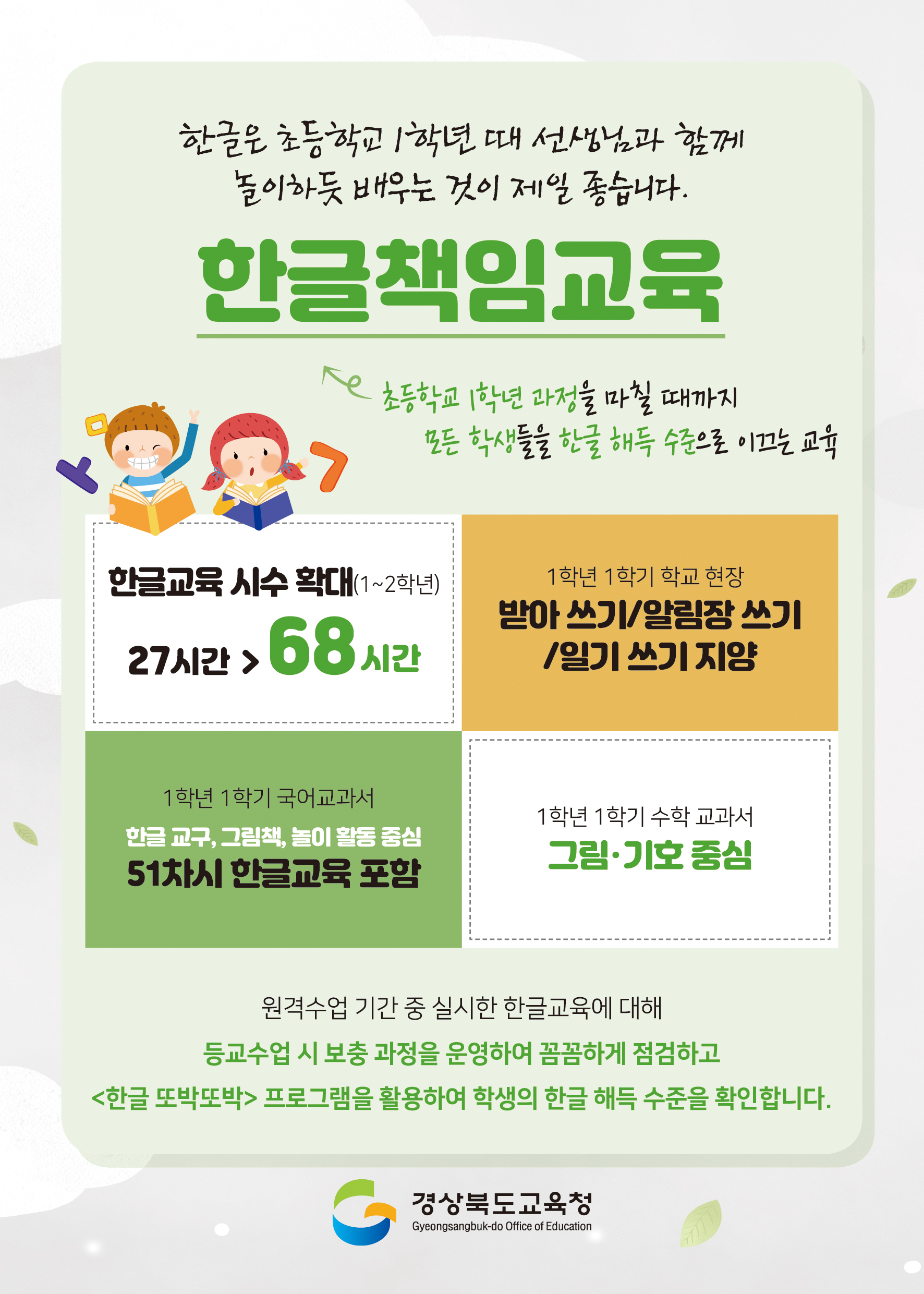 코로나19로 인해 수업일수와 수업시수가 10% 감축 되었지만, 경북교육청은 초등학교 1학년의 체계적인 한글책임교육 실현과 보장을 위해 1~2학년 한글교육 시수를 68시간 이상 확보하도록 했다.
