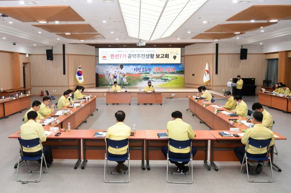 김천시는 6월 25일(목) 시청3층 강당에서 2020년도 상반기 기준『공약추진상황 보고회』를 개최하였다. 공약추진상황 보고회에서는 그간의 공약추진경과를 현 시점에서 점검하고, 예상 문제점을 파악하여 시민과의 약속이 단 1건이라도 누락되지 않도록 지속적으로 관리한다.