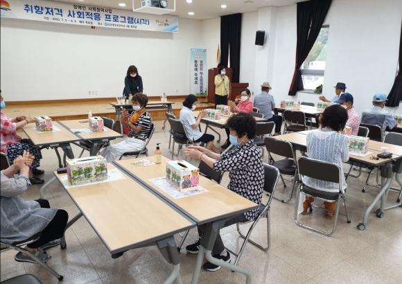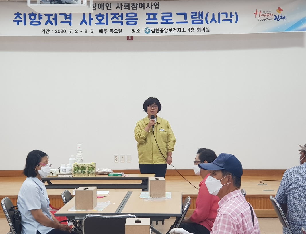 | 김천시보건소는 7월 2일부터 8월 6일까지 매주 목요일 중앙보건지소 4층 회의실에서 지역사회 시각장애인의 취미활동 공예 프로그램을 운영한다. 이번 프로그램은 시각 결손으로 인해 사회활동에 제한이 있는 시각장애인들에게 공예 프로그램을 제공하여 자존감 향상 및 우울감을 해소와 삶의 만족도를 제고하기 위한 목적으로 운영된다. 매주 목요일 6주 과정으로 진행되는 공예 프로그램은 휴지케이스, 수경화분, 천연비누, 다육이 화분, 모기퇴치스프레이, 냄비받침 만들기 등 다양한 만들기 활동으로 구성되어 있는데, 이러한 공예 활동의 감각자극을 통해 정서적 안정과 사회적 활동에 적응할 수 있는 능력을 향상 시킬 계획이다.