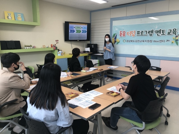 | 경상북도김천교육지원청(교육장 마숙자) Wee센터는 7월 6일(월) Wee센터 소통방에서 돋움·디딤 프로그램 멘토 6명을 대상으로 위촉 및 사전교육을 실시하였다. 돋움·디딤 프로그램’이란 위기학생 지원을 위한 각계각층 돋움이의 다양한 기부와 자발적 봉사로 나눔을 실천하는 활동으로, 디딤이의 정서적 지지와 역할모델로 위기학생의 보호와 성장을 위한 돋움이와 디딤이를 1:1로 연결하는 멘토링 네트워크 체제이다.