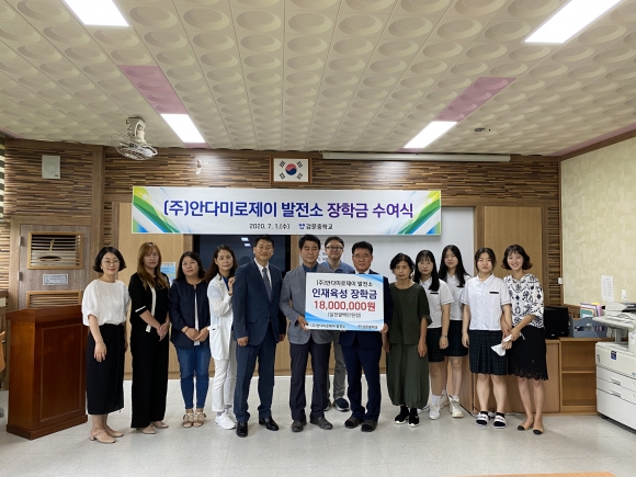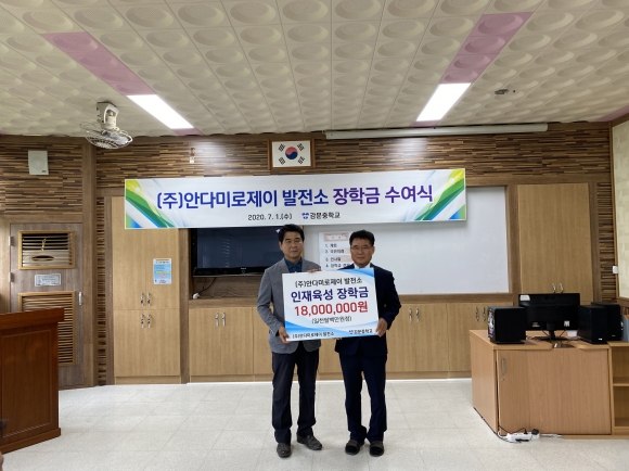 | 김천 감문중(교장 황경연)에서 7월 1일(수) “안다미로제이발전소 장학금 전달식”을 실시하였다. ㈜안다미로제이발전소(대표 강영서)는 7월 1일(수) 오전 10시 감문중 도서관에서 학교운영위원과 학부모들이 참석한 가운데 장학금 전달식을 가졌다. 이날 전달된 장학금은 1,800만원으로 전교생 20명에게 1인당 90만원씩 지급할 예정이다. 장학금 전달식에서 강영서 대표는 “태양광 발전을 통해 얻은 수익의 일부를 지역사회에 환원하는 취지에서 장학금을 기증하게 되었다”고 장학금 취지를 이야기하며 “이 장학금을 통해 감문중학교 학생들이 꿈을 실현할 수 있는 디딤씨앗이 되었으면 좋겠습니다”라는 기탁의도도 밝혔다. 아울러 향후 지속적으로 학생들을 지원할 수 있는 방안을 모색해보겠다며 지원 계획도 제시하였다. 이에 황경연(감문중교장)은 “학생들은 이번에 받은 장학금의 의미를 살려, 지역사회 발전과 이웃을 도울 줄 아는 마음을 가진 사람으로 성장하면 좋겠다”라며 소감과 당부를 하였다.