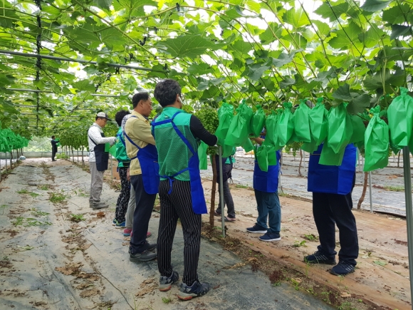 | 대신동 새마을협의회는 지난 7월 3일 회원 10여명이 참여한 가운데 농촌 일손 돕기 봉사활동을 펼쳤다. 농번기 일손부족으로 어려움을 겪는 문당동 당곡마을의 포도 농장을 방문하여 새벽 5시 30분부터 포도 봉지 씌우기 등 영농활동을 도왔다.