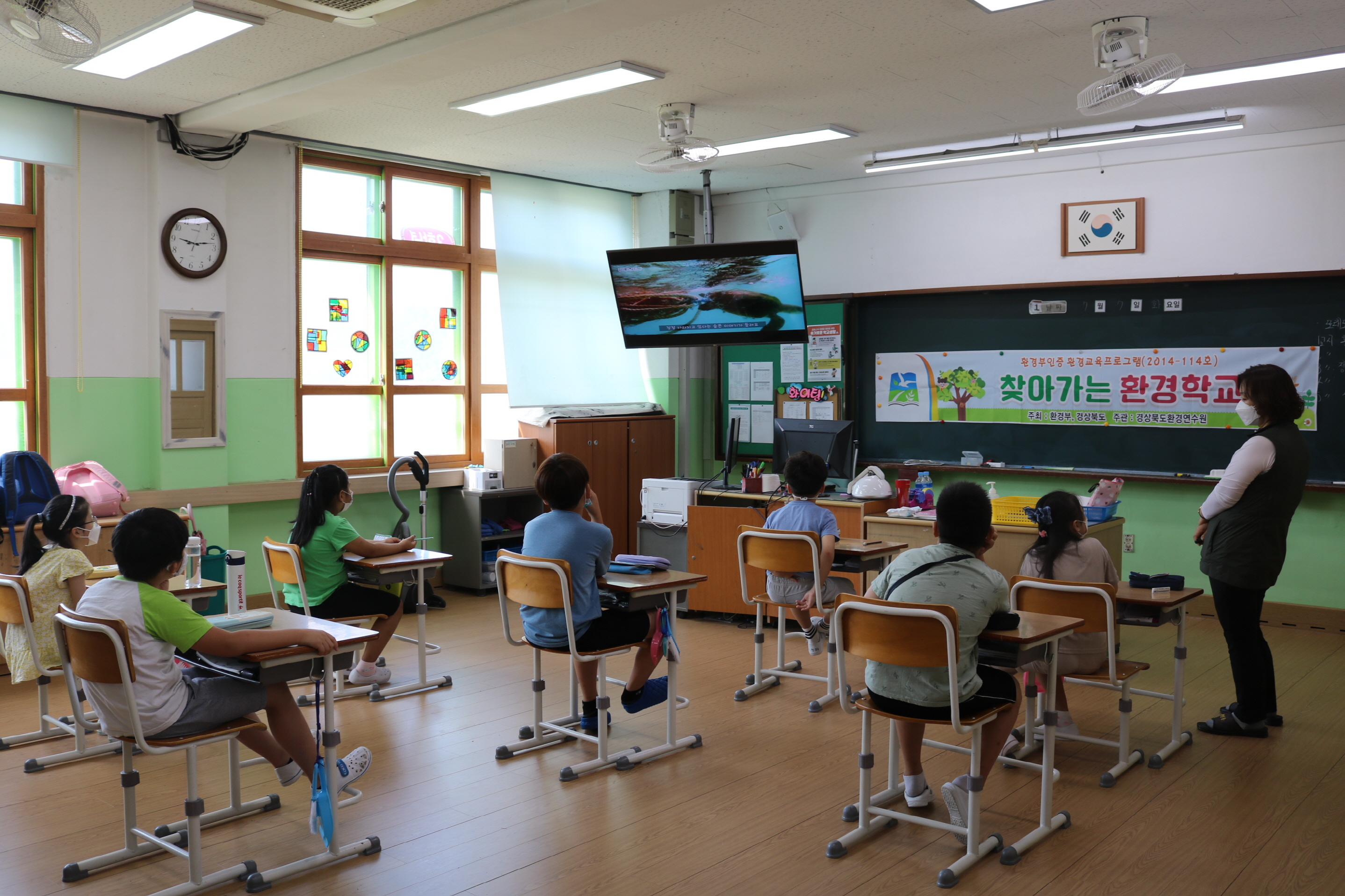 찾아가는 환경학교는 최근 코로나 19로 현장체험 교육 진행이 어렵다는 점에 착안해 기존 저학년/고학년 집합 교육에서 벗어나 학급 담임제 방식으로 진행하였다. 1교시에는 ‘자원순환과 올바른 분리 배출’ 이란 주제로 생활 속에서 발생하는 비닐과 플라스틱 문제에 대해 학생 스스로 생각해 보는 시간을 가졌다. 2교시에는 환경교육은 코에 꽂힌 빨대와 뱃속을 가득 채운 쓰레기로 괴로워하는 바다 거북이를 닮은 가치상자를 만들어보는 시간을 가졌다. 또한 재활용 퍼즐을 풀며 생활 속에서 발생하는 플라스틱에 대한