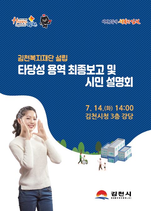 | 김천시는 오는 7월 14일 오후 2시 김천시청 3층 강당에서 김천 복지비전을 제시하고 주민들의 의견을 수렴하고자 『김천복지재단』설립 타당성 용역 최종 보고 및 시민 설명회를 개최한다.