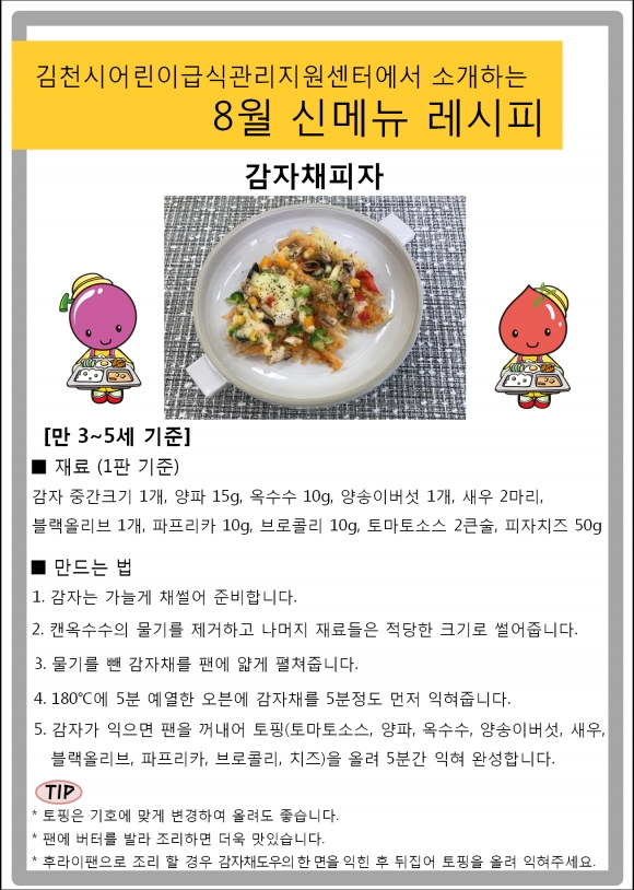 | 김천시 어린이급식관리지원센터(이사장 김재광)에서는 코로나-19로 인하여 사회적 거리두기와 바깥활동이 줄어들고 있는 이 시기를 가정에서 잘 활용할 수 있도록 매달 제공되는 식단의 신메뉴 레시피를 영상으로 제작하여 제공하고 있다. 이번 8월 식단의 신메뉴 레시피는 감자를 이용한 ‘감자채피자’ 이다. 밀가루 대신 치즈와 찰떡궁합인 감자를 이용해 튼튼! 쑥쑥! 건강한 피자를 만들어 먹어보자.