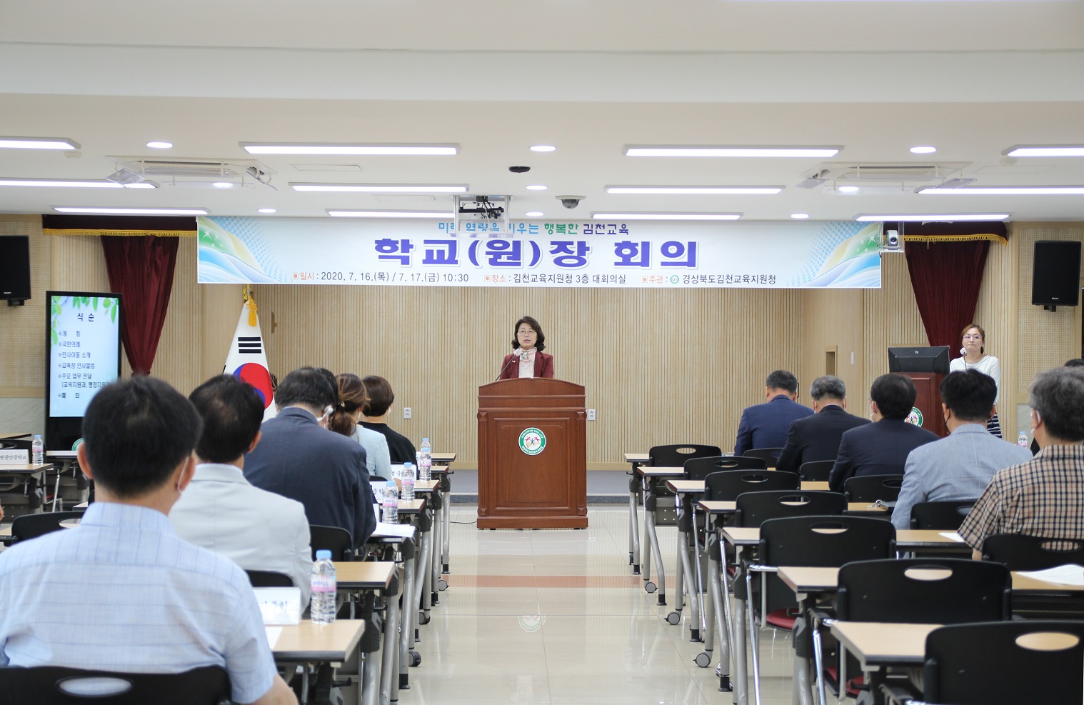 | 경상북도김천교육지원청(교육장 마숙자)은 2020년 7월 16일(목), 7월 17일(금) 오전 10시 30분 관내 유‧초등학교와 중‧고‧각종학교 2그룹으로 나누어 학교(원)장 회의를 개최하였다.
