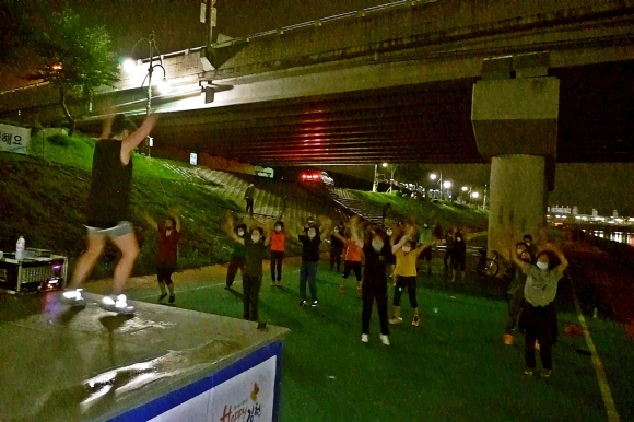 코로나-19 예방수칙 0순위. 주기적인 현장 방역소독과 발열체크, 손소독, 마스크 착용, 2M 거리두기를 유지한 상태에서 건강체조 프로그램을 진행. 참가자뿐 아니라 일반시민 모두가 안전하게 즐길 수 있도록 준비하였다.