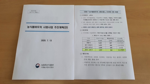 | 김천시(시장 김충섭)는 지난 7월 농림축산식품부 주관‘2020년 농식품바우처 시범사업’공모에 선정되어 국비 10억여원을 확보한 이후 사업추진 준비에 박차를 가하고 있으며 오는 8월부터 신청접수를 받는 등 본격적으로 사업을 시행할 예정이다.