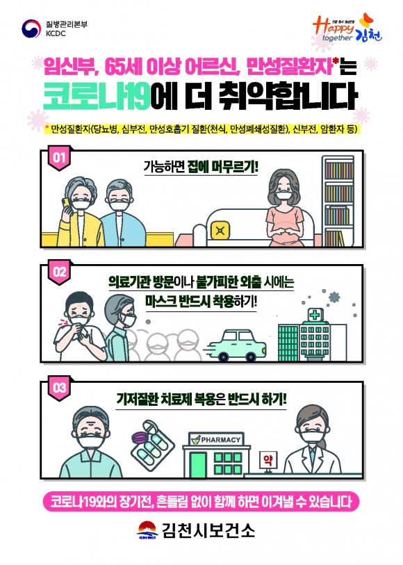 현재 김천시는 코로나19 환자가 없는 안전한 지역이지만, 경로당을 주로 이용하는 어르신들은 감염에 취약하기 때문에 고위험군의 건강과 안전을 보호하기 위해서이다. 이번에 보건소에서 지원하는 방역물품은 손소독제, 분무형 소독제 및 물티슈 등으로, 코로나19는 비말 접촉을 통해서도 전파가 가능하기 때문에 난간이나 문고리 등 사람들이 접촉이 많은 물건 표면을 소독해주는 것도 예방에 도움이 된다.