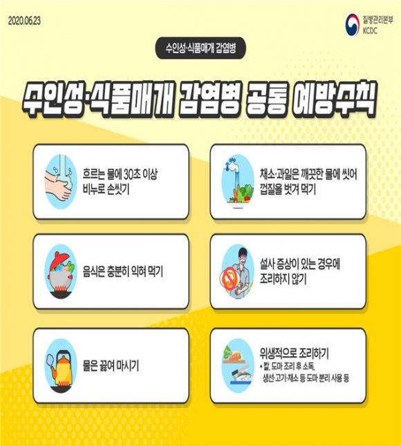 수인성, 식품매개 감염병을 예방하기 위해서는 △흐르는 물에 30초 이상 비누로 손씻기 △끓인 물 마시기 △충분히 익힌 음식 먹기 △설사증상이 있는 경우 조리하지 않기 △조리도구 소독하여 사용하기 등의 예방수칙을 준수하는 것이 중요하다.