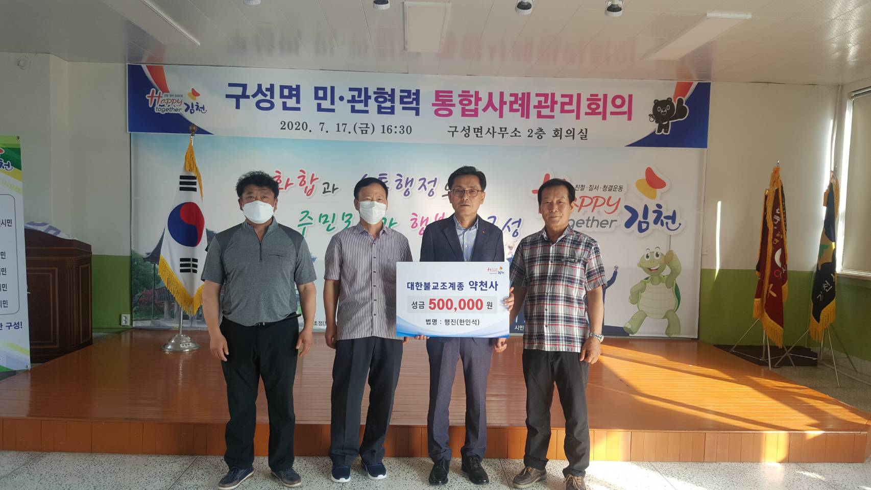 | 김천시 구성면 대한 불교 조계종 약천사에서 수행 중인 행진스님이 구성면사무소에 방문하여 코로나-19로 어려운 가정을 위해 써 달라며 상품권 50만원을 기탁했다.