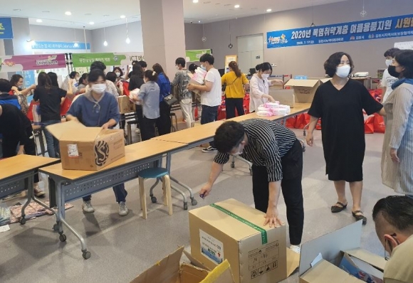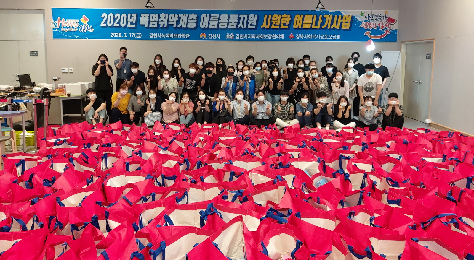 여름나기 용품은 인견이불, 손선풍기, 쿨스카프 등 10만원 상당의 물품으로 구성되어 있으며, 이날 물품전달을 위해 김천시지역사회보장협의체와 지역 사회복지기관 종사자들이 참여하여 함께 물품꾸러미를 직접 포장하고 각 가정으로 배부하였다.