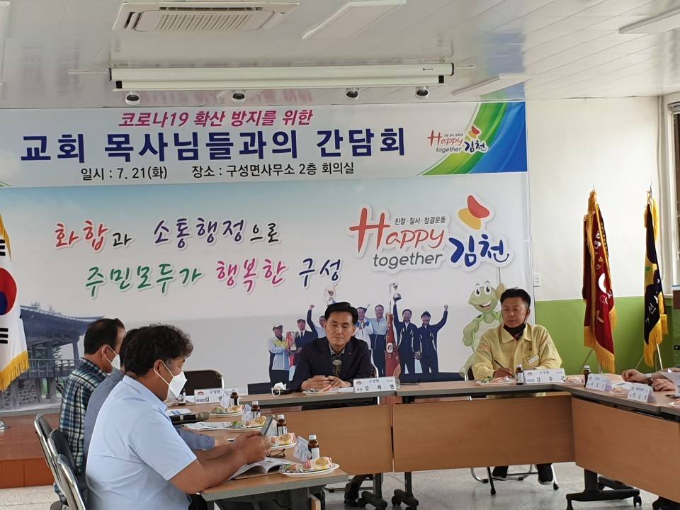 | 김천시 구성면(면장 강희현)에서는 지난 21일 관내 구성교회 이호건 목사외 6명의 교회 지도자가 참석한 가운데 코로나19 핵심 방역 수칙 준수의 적극적인 실천을 위한 간담회를 개최했다