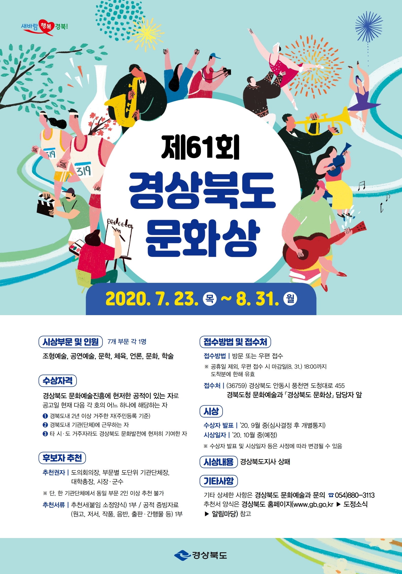 -‘2020 경상북도 문화상’후보자 공개 모집, 7.23 ~ 8.31까지 접수 - - 조형예술, 공연예술, 문학, 체육, 언론, 문화, 학술 7개 부문 -