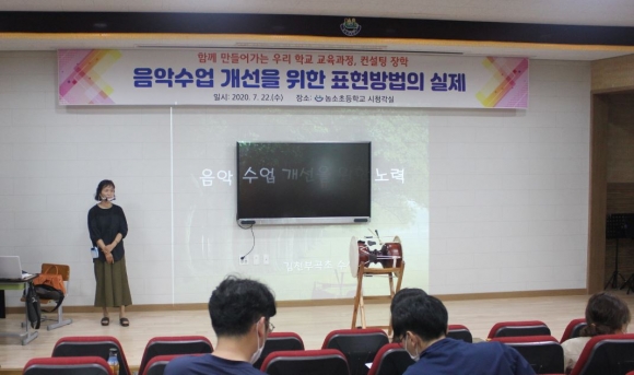| 농소초등학교(교장 오재만)는 7월 22일(수) 시청각실에서 김천부곡초등학교 이명희 수석교사를 모시고 전교원을 대상으로 ‘음악수업 개선을 위한 표현 방법의 실제’라는 주제로 컨설팅 장학을 실시했다.