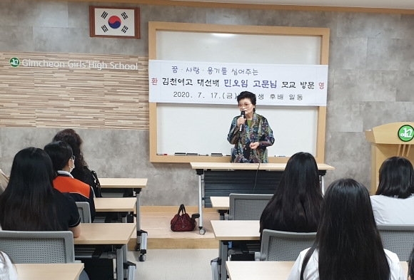 지난 7월 17일(금) 김천여자고등학교에서는 구순을 바라보는 대선배와 후배들의 소박한 만남의 시간이 펼쳐졌다. 화제의 주인공은 현재 서울에 거주하고 있는 85세의 민오임 씨! 이날 학교를 방문한 민씨는 후배들을 위해 즉석에서 3천만원을 기탁하고 간소한 간담회를 가졌다. 후배들이 질문하고 선배가 대답하는 형식으로 전개된 이 자리에서 민씨는 “후배들이 꿈을 갖고 열심히 공부하여 학교를 빛내주고 훗날에는 모교를 위하여 사랑을 베풀어 줄 것”을 당부했다.