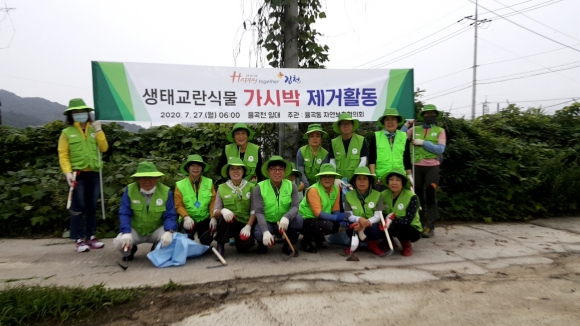 | 김천시 율곡동(동장 이우문)에서는 7월 27일(월) 자연보호협의회 주관으로 율곡천 일대에서 생태교란식물인‘가시박’제거 활동을 했다.