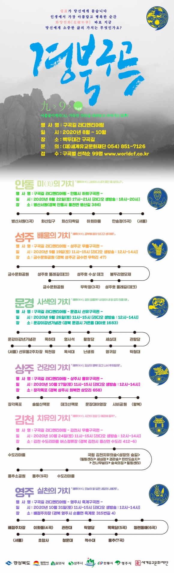 △8월 22일 안동 하회구곡을 시작으로, △9월 19일에는 성주 무흘구곡(1~5곡), △9월 26일에는 문경 선유구곡, △10월 17일에는 상주 용유구곡, △10월 24일에는 김천 무흘구곡(6~9곡), △10월 31일에는 영주 죽계구곡에서 진행되며, 코로나19 확산방지와 생활 속 거리 두기 지침 준수에 따라 매회 99명을 선착순 모집한다.