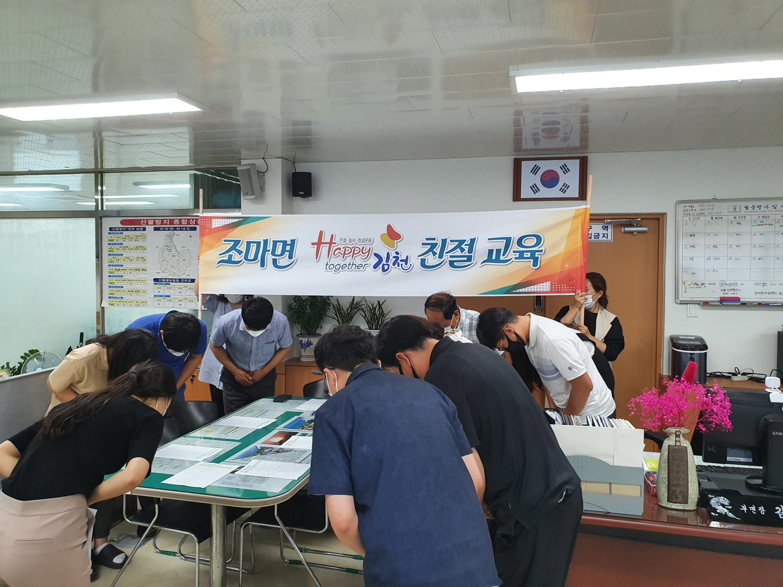 김천시 조마면(면장 위성충)은 8월 4일 조마 면사무소에서‘해피투게더 인사 실천하기’운동에 관한 교육을 실시하였다. 이 날 교육은 민원응대 「해피투게더 인사 실천하기」 운동 전개의 일환으로 전화응대 매뉴얼 및 맞이인사 매뉴얼을 통해 민원응대의 전문성을 높이고 친절도 향상을 통해 시민과 공무원이 함께 만족하는 고객만족 문화조성을 목표로 하고 있다.