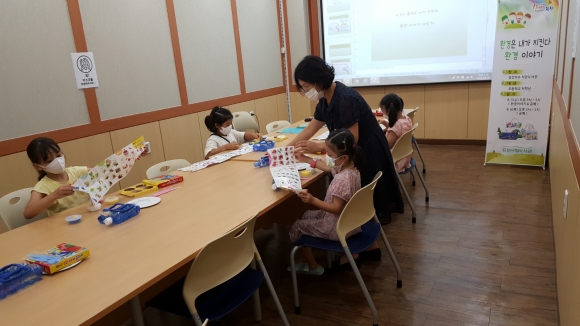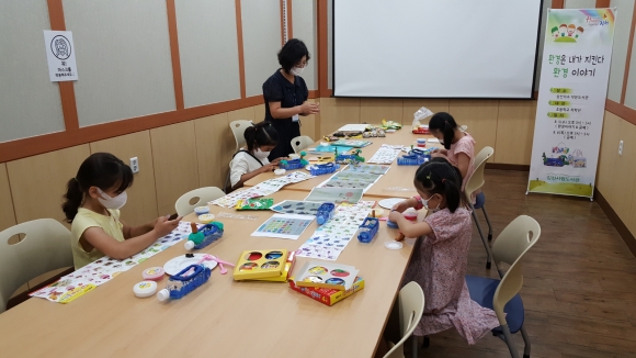 여름방학을 맞아‘지구 환경이야기’란 주제의 특강으로 진행된 이번 수업은 아이들이 책읽기의 다소 단조로운 방식에서 벗어나 책을 읽고 페트병으로 북극의 바다 만들기, 폐목으로 문패 만들기, 에코백 만들기 등 내 손으로 직접 만들어 보고 지구 환경에 대해 친구들과 이야기도 나눠보는 즐거운 내용으로 진행되었다.