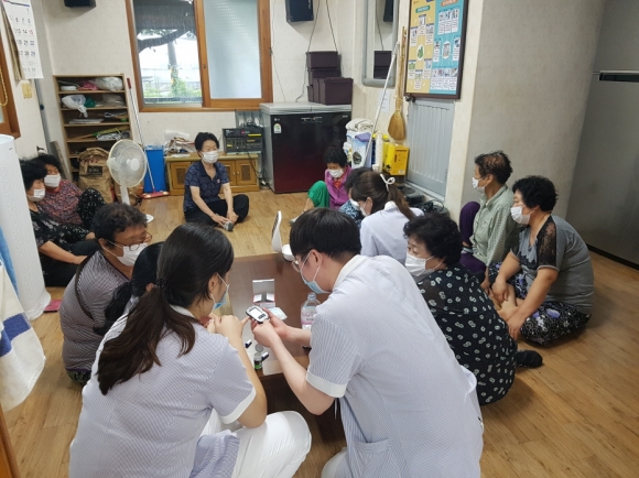 | 김천시는 코로나19로 폐쇄되었던 경로당이 개방됨에 따라 건강생활지원센터와 경북보건대학교 간호학과 학생들이 함께 8월 첫 주부터 매주 금요일, 봉산면 경로당 9개소를 한 주마다 1개소 방문하여 만성질환 교육을 실시하고 있다. 고혈압·당뇨·고지혈증 등의 만성질환은 연령이 증가할수록 발병률이 증가하고, 일단 발생하면 완치가 쉽지 않으며 호전과 악화를 반복하다 결국 점점 나빠지는 방향으로 진행된다.